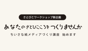 さとびごころ秋号づくりの様子を、そろそろお伝えする頃になりました。その前に、夏号のおしまいのほうに掲載していたお知らせの件を。 思えば長い間、さとびを作ってきて、その間にイベントを企画したりワークショップの主催もしてきま … 続きを読む ひっそりお知らせ。あなんのワークショップ始めます。個人で紙メディアを作りたい人に。