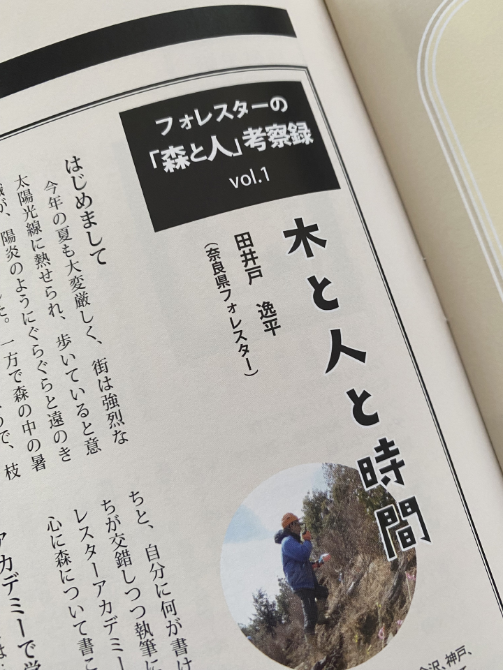 コラム フォレスターの「森と人」考察録 by田井戸逸平 ひさしぶりの考察録シリーズは、今回からの新連載。奈良県フォレスターアカデミー卒の田井戸さんにお願いしました。奈良県職員として任地に降り立ったフォレスターの「行政向け」ではないコラムから、森林を管理する立場の若者の思いを感じてもらえたらと思います。1年間続きますので、どうぞよろしくお願いします。過去の考察録筆者には、下北山村の北直紀さん、曽爾村の高松さん、現在連載中の杉浦さんなどがいらっしゃいます。今みなさん地域のキーパーソン。田井戸さんのこれからにもエールをお願いします。