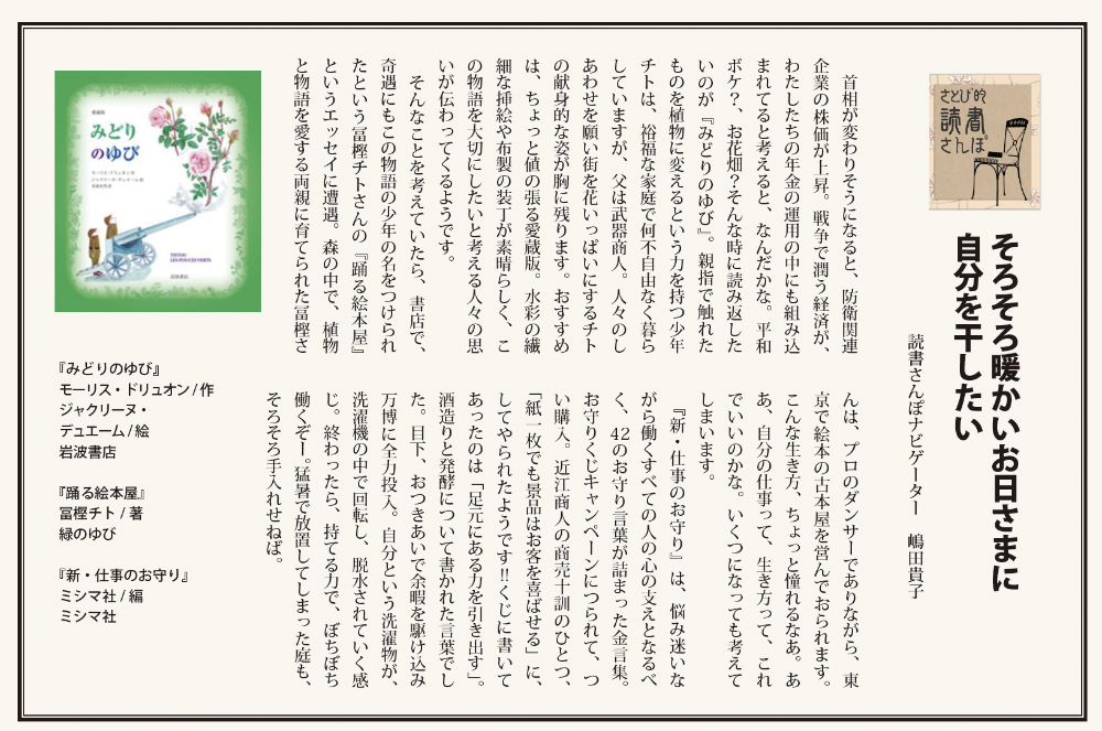 さとび的読書さんぽ by 嶋田貴子 今月で終わる万博。嶋田さんも行ってきたそうです。そんな中でもコラムはきちんと入稿していただきました。さとびの連載の中で最も長期にわたり寄稿していただいています。いつもセレクトがしぶいんです。全文を載せてみました。軽妙なコラムの中に、ちらりと見えるお考え、お楽しみください。