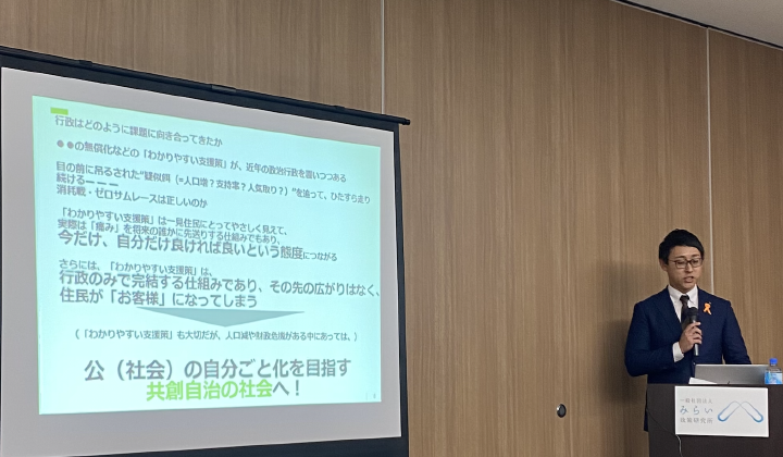 このセミナーでは、町の政策等の具体的なことは主に配布資料にまかせ、その背景にある考え方を中心にお話されていました。その中で、印象に残ったポイントは、「制度や補助金よりも地域を作るのは人なんだ」という考え方。こちらは、前職の森章浩元町長の方針をひきついでおられるようですが、副町長としてともに推進してこられたはずで、熱がこもっていました。