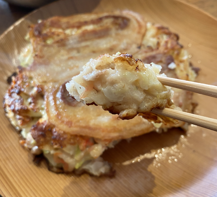 それが、このお好み焼きである。じゃじゃん。美味しいよ。部員Mさん、ありがとう。(ちなみに、お皿はアップルジャックさんの)