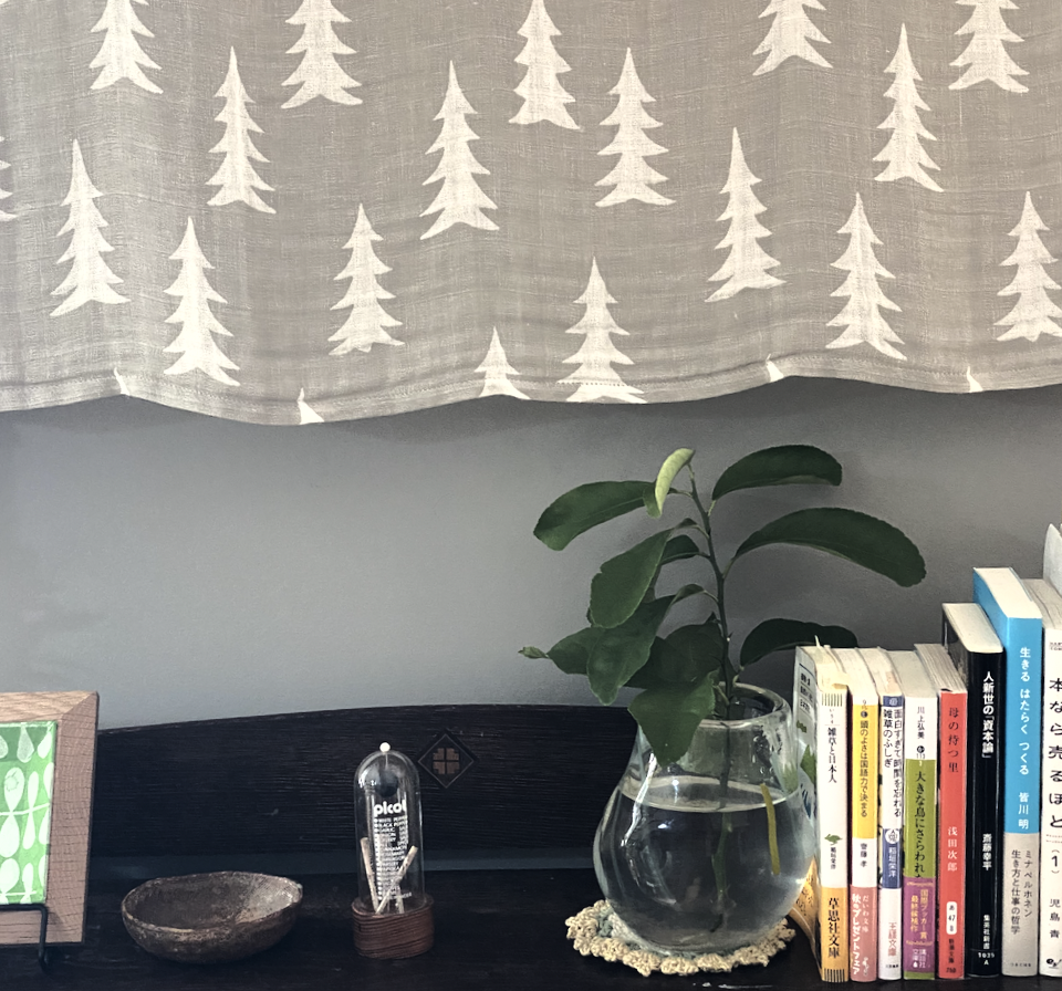 ガーゼのカーテンの奥には、なんとエアコンの配管があります。目隠しに貼ってみたら、とてもしっくりきました。カーテンにしている布は、長男からのプレゼント。ナイスな選択でした、ありがとう。