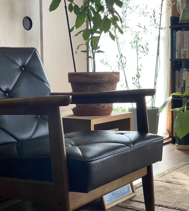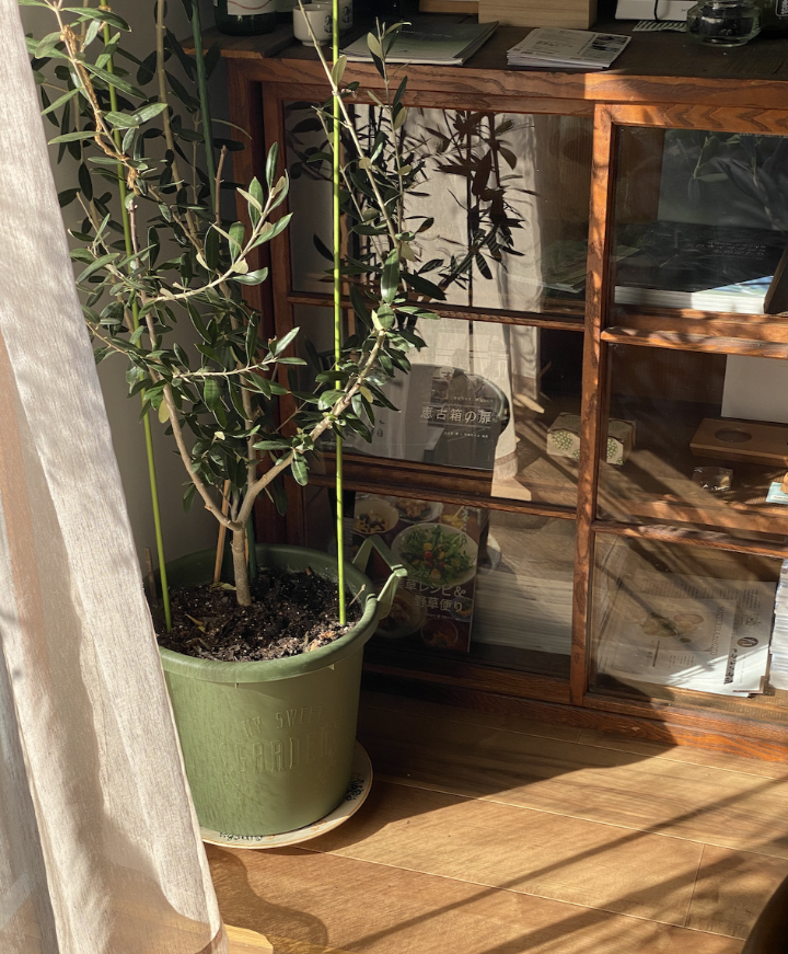冬の低い日差しが部屋の中まで入ってきて、カーテンがゆれるのが好き。家具も古道具店で求めたものがほとんどで、よく似合います。オリーブはベランダが寒すぎるので、避難中。