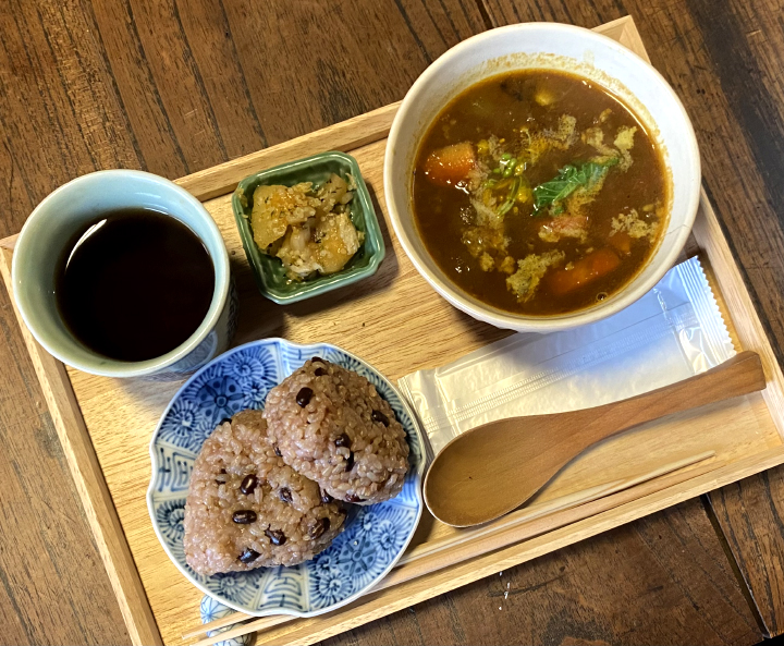 ランチタイムは、恵古箱さんの講座特製ランチをいただきます(講座料金に含まれてます)。今回はカレー風味のスープがポイント。野菜はすべてメグちゃんがおつきあいのある農家さんから仕入れたものばかり。副菜のドレッシングは、自家製の柿酢ベースですって。